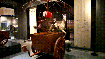 操作展臺上的轉動盤,車體同步旋轉而指示方向道具小人不動。通過這個復原機械互動裝置,感受古代科學家對測量距離機械裝置的研究和探索精神。