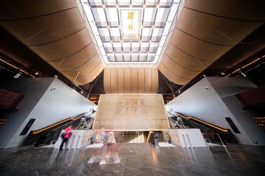 金石淵藪,翰墨津梁 東方文化寶庫 西安碑林博物館 驚艷歸來! 西安碑林博物館全新展陳開放 整座博物館展陳面積 躍升至23000平方米 新增五大常設展覽 展出文物增至2000余件 類型更加豐富 北區場館為一座地上一層、地下二層的大型清水混凝土建筑。陳列展覽大氣宏闊、莊嚴肅穆,結合建筑所構造的空間形式,通過互聯網+數字展覽等創新設計方式,加強對館藏文物的活化利用。 金螳螂文化設計實施位于北區新館一層的“星耀長安——西安碑林博物館碑刻珍品展”。 “星耀長安——西安碑林博物館碑刻珍品展”通過26方碑刻珍品和中國碑文化、王羲之書法精神、顏真卿書法精神、柳公權書法精神、唐代佛教文化、碑刻生命之傳續等六組專題,全面展示了西安碑林館藏碑刻珍品的歷史價值和藝術價值。 該展覽中七方顏碑、五方柳碑首次集中展出。其中,顏真卿書馬璘新廟碑、柳公權書楊承和碑、嚴公貺墓志為首次展出。 這些碑刻從原本緊密陳列的老館區搬到了寬敞明亮的“豪華單間”,讓游客可以360度無死角欣賞碑石文化。此外,還增加了多媒體設備和互動展項,為游客帶來全新的文化體驗。 巍巍秦嶺下,三秦大地上 有中華文明氣勢恢宏的開篇 鑒往知來,向史而新! (視頻號:陜視新聞)