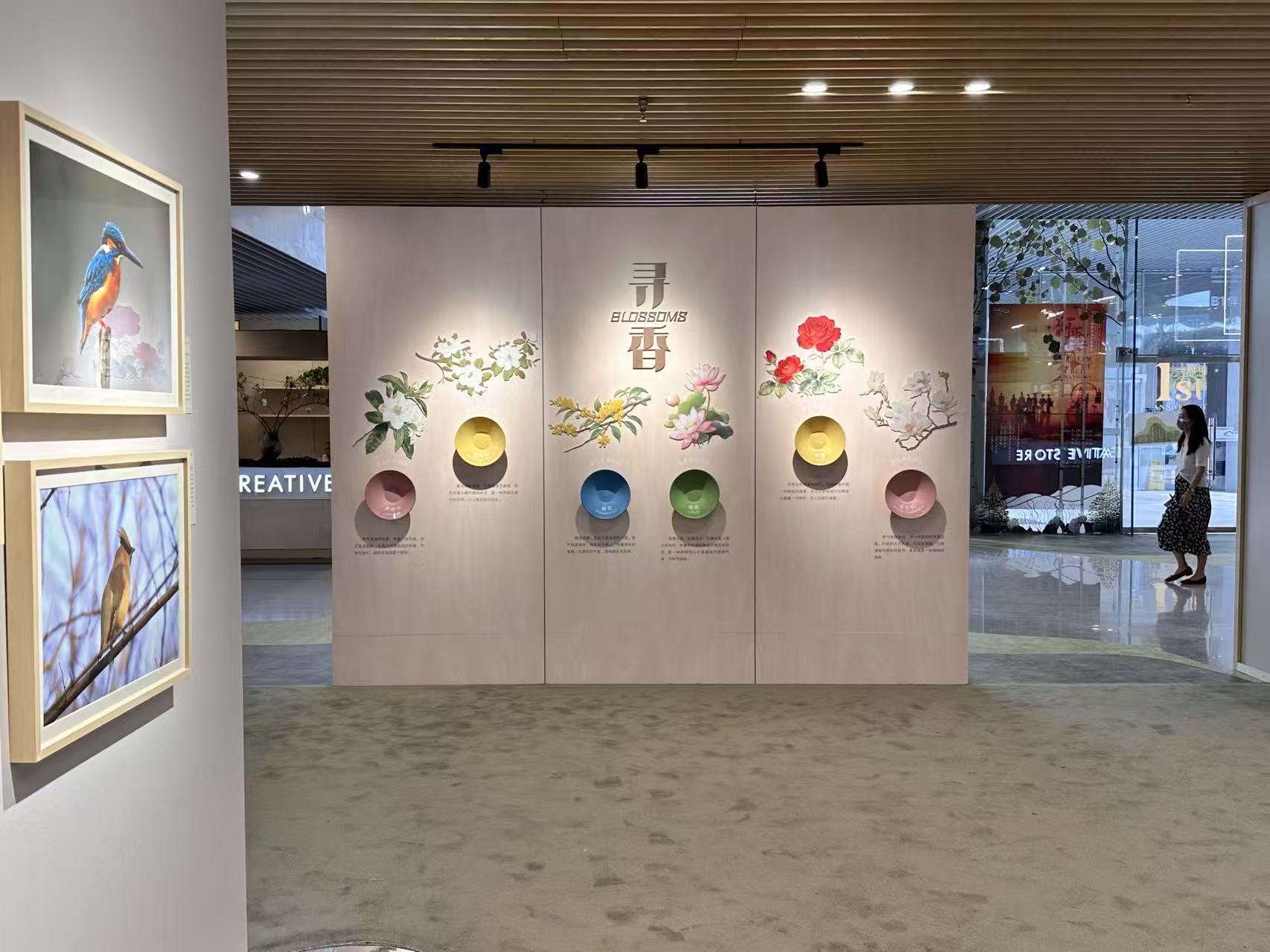 展覽核心區域通過攝影作品與互動裝置相結合,觀眾可依次體驗“綠境啟程、鳴聲識鳥、聞香識花、林間探鳴”等多感官互動裝置,形成視覺、聽覺與嗅覺的沉浸式體驗。